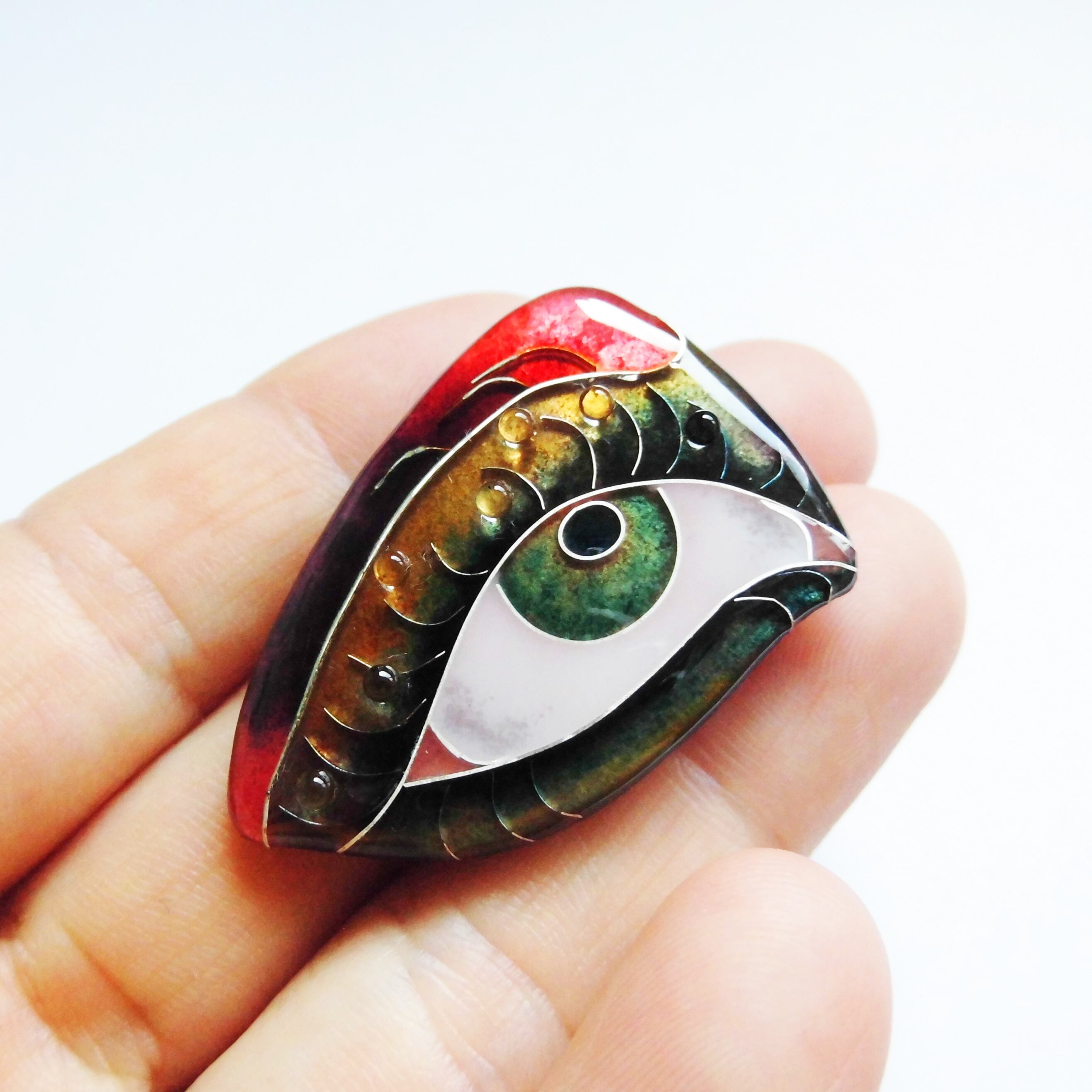 きらびやかでどこか怪しく、はかない雰囲気をまとった目のブローチです。